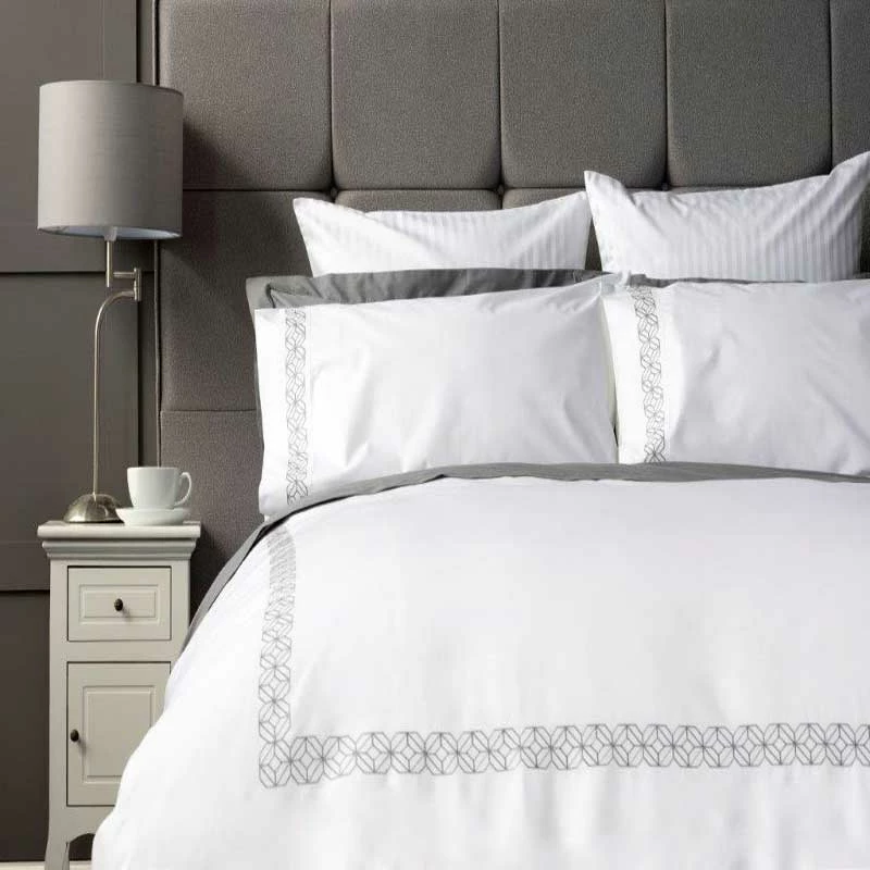 100% Cotton Percale200 Thread CountSet Includes Pillowcase(s)Swift Swop Duvet CoversCloses with ButtonsColours: White, Platinum Embroidery