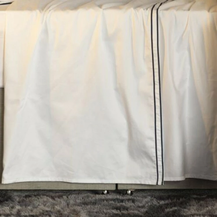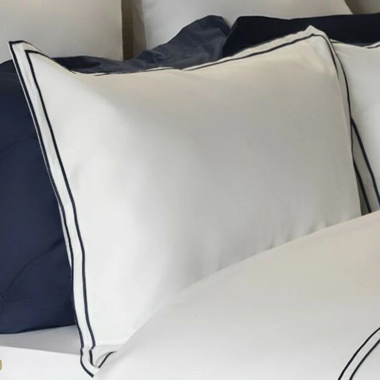A classic 200 thread count Egyptian cotton fabric in crisp white with a striking navy embroidered trim.