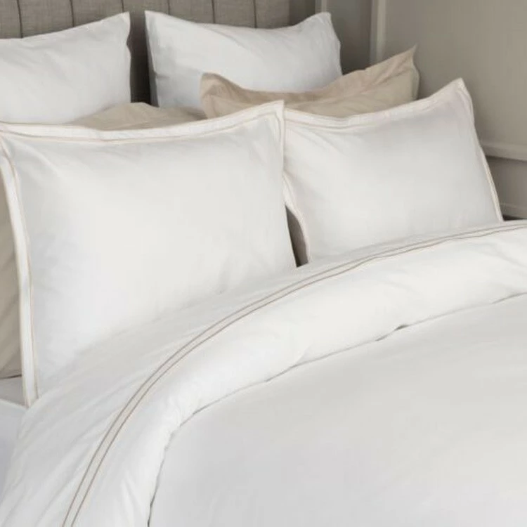 A classic 200 thread count Egyptian cotton fabric in crisp white with a striking Oyster embroidered trim.